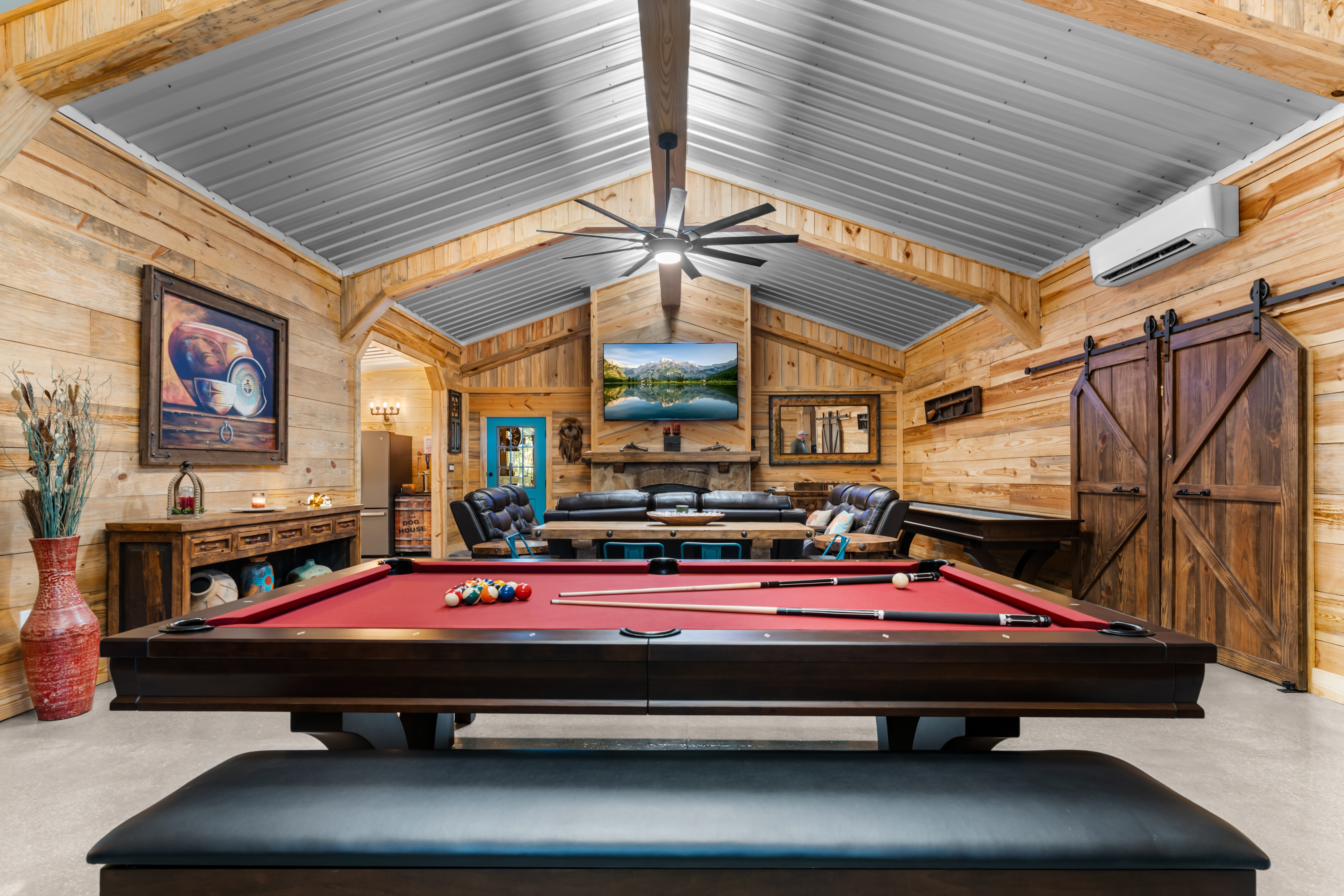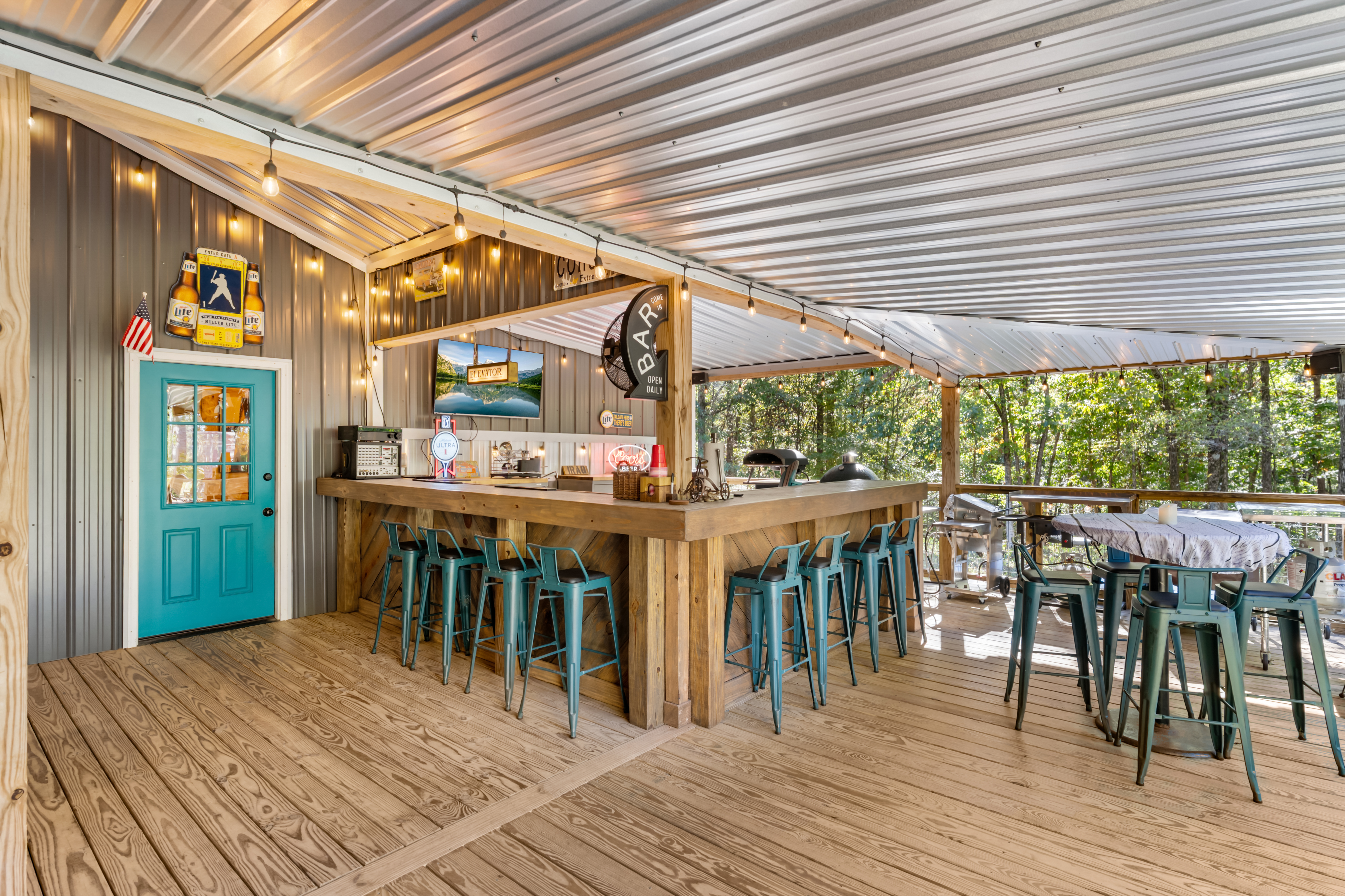 The main building, would make a great gathering space for entertaining guests and family and friends. It features a large open concept with high ceiling, wooden interior wall accents, a kitchenette, plenty of storage space in the form of closets, additional rooms, and a bathroom. It features a commercial size bar, complete with covered outdoor sitting space to entertain many guests.