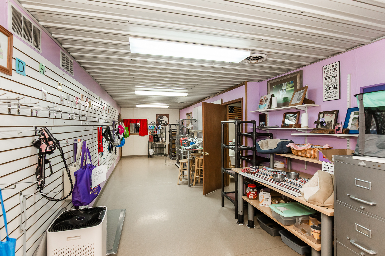 The kennel facility is fully operational and purpose-built, featuring a welcoming office and lobby, 66 indoor runs, 45 outdoor runs, 3 indoor/outdoor runs, 7 outdoor fully fenced play areas, and 8 indoor cat suites. The operation is supported by two grooming rooms, two wash bays, food storage and laundry areas, extensive concrete flooring, integrated drainage and wash-out systems, and five HVAC systems, allowing for efficient, scalable operations. Two additional 25’×40′ metal storage buildings with concrete floors and electrical further enhance functionality. This property is ideally suited for an owner-operator seeking to live on-site, expand grooming or boarding services, or potentially convert the facility into a veterinary clinic, creating a comprehensive, full-service animal care campus in one of the strongest pet-service markets in the region.