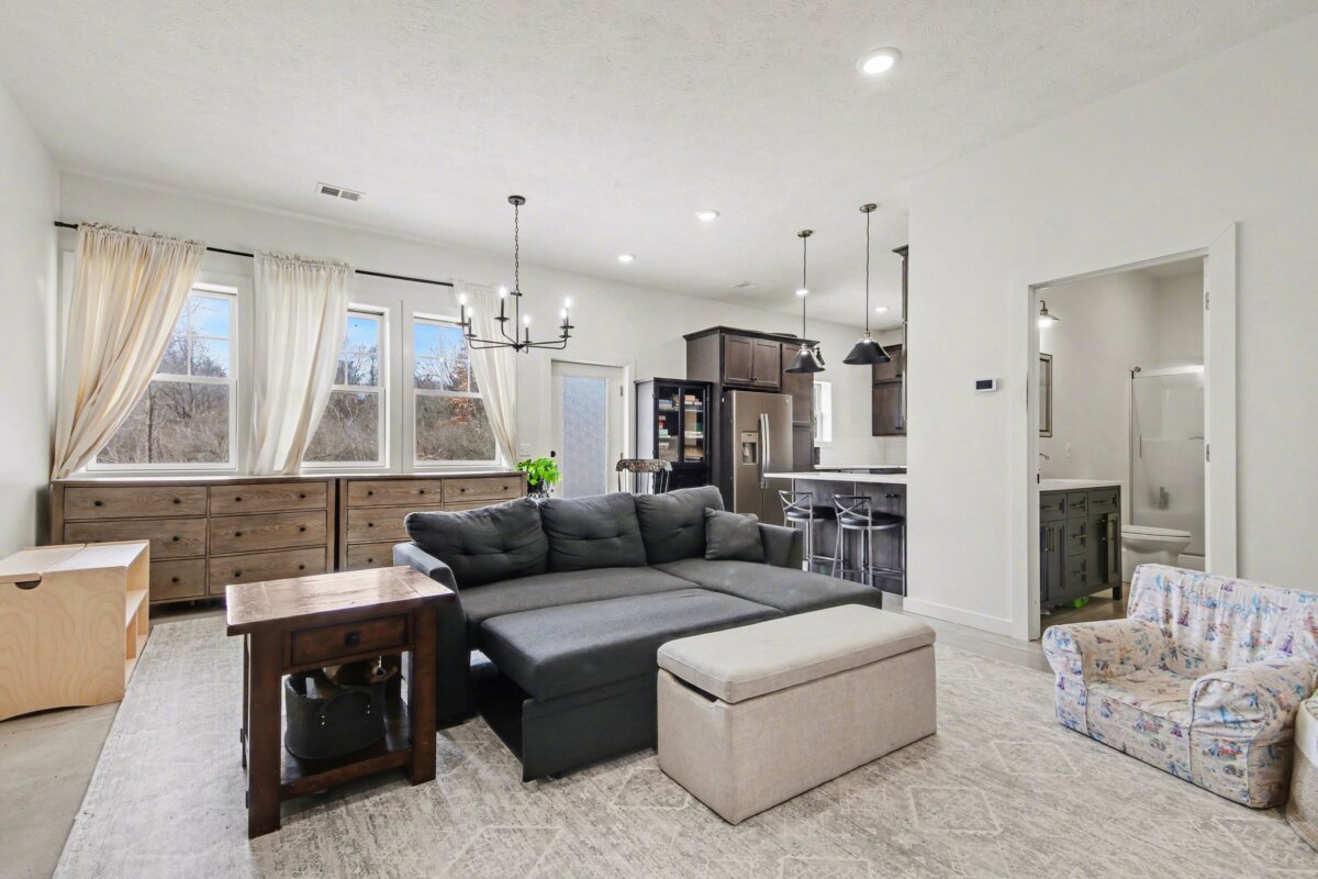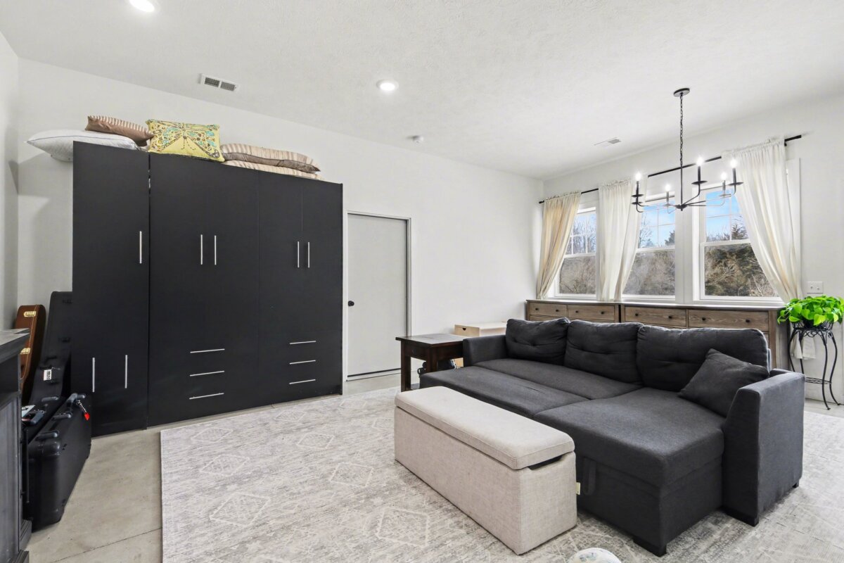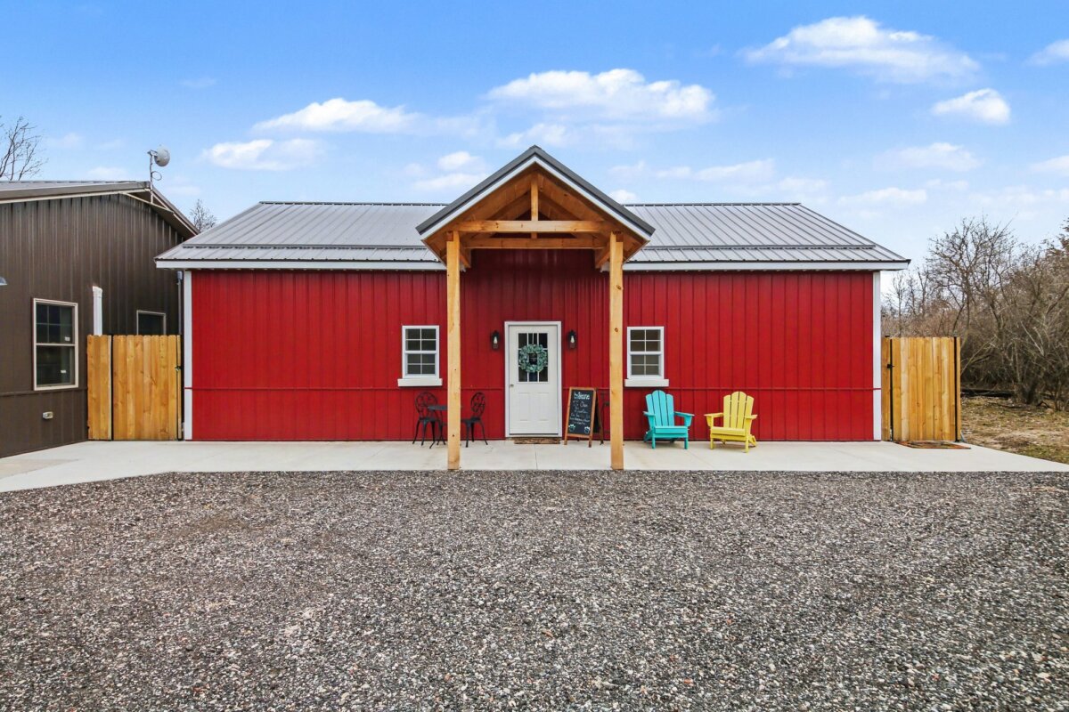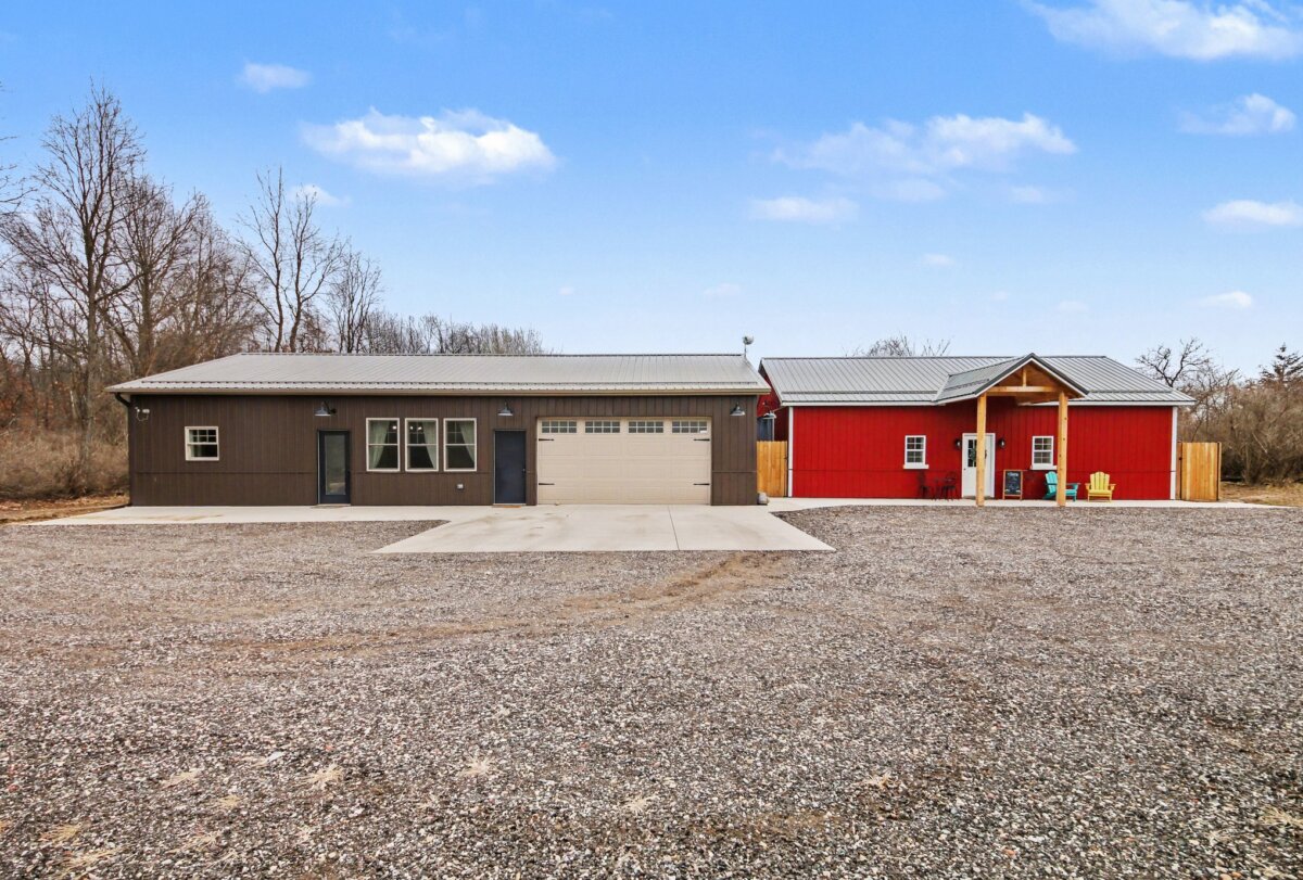 The beautiful barndominium with studio-style living quarters features a Murphy bed, granite countertops, a spacious kitchen, and a large bathroom with double vanity–perfect for on-site living, guests, or caretaker accommodations.