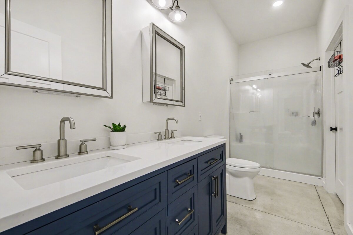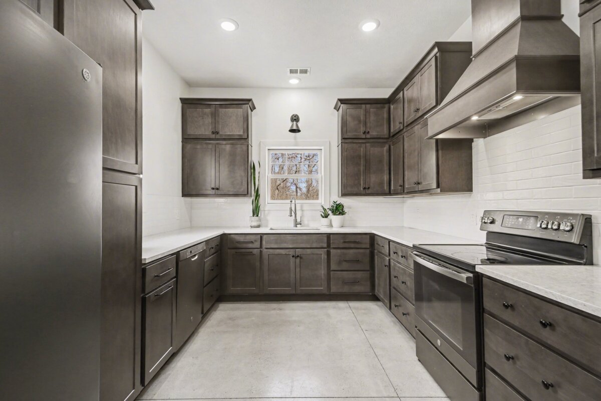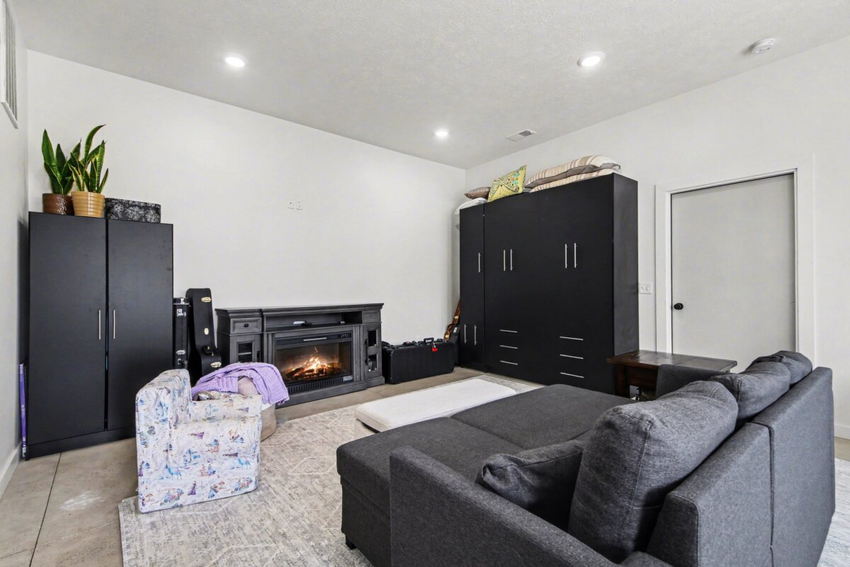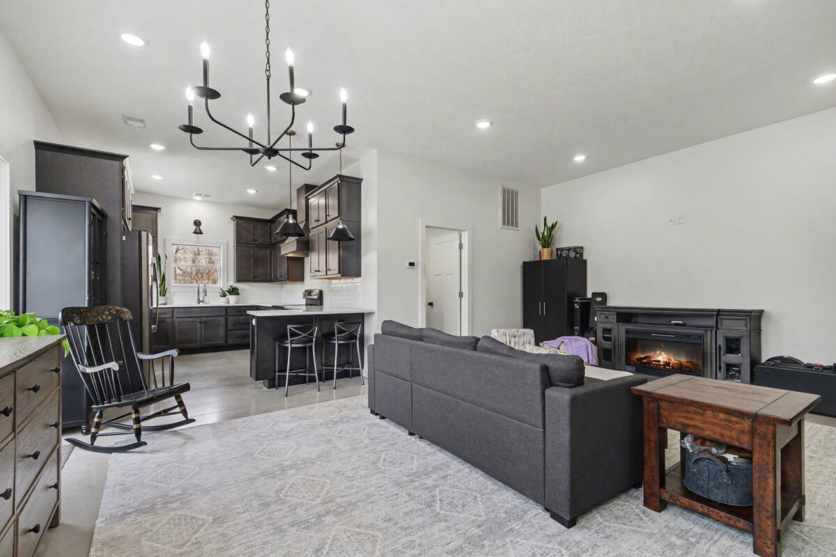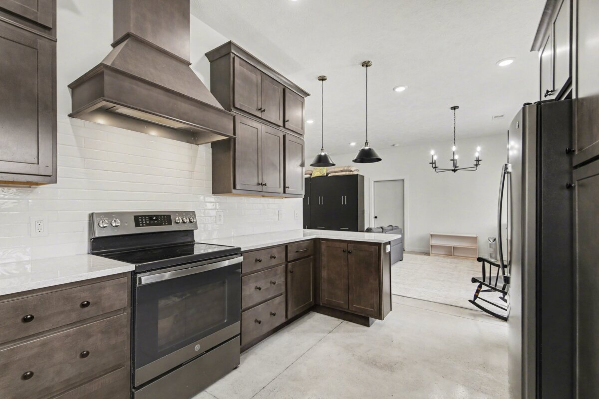 The beautiful barndominium with studio-style living quarters features a Murphy bed, granite countertops, a spacious kitchen, and a large bathroom with double vanity–perfect for on-site living, guests, or caretaker accommodations.