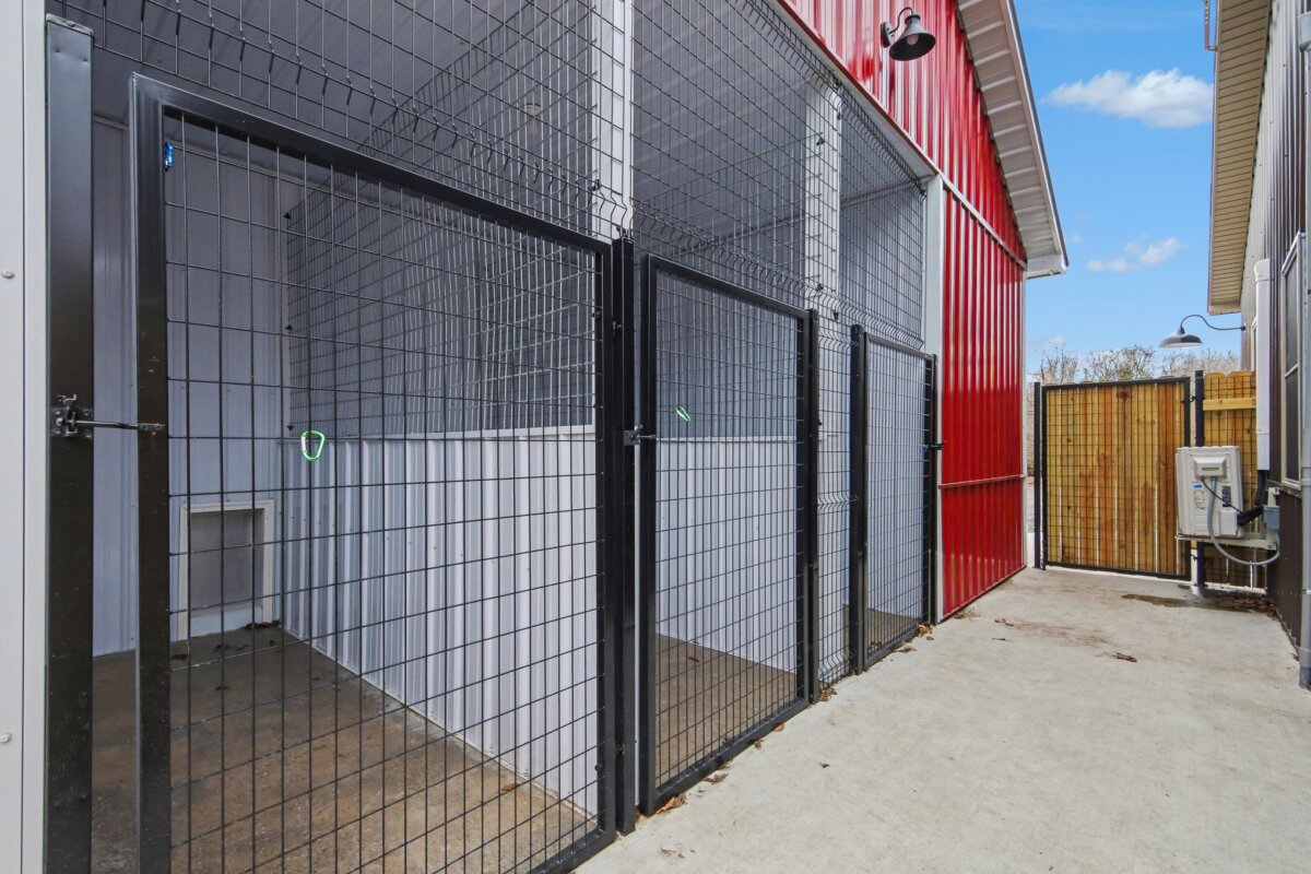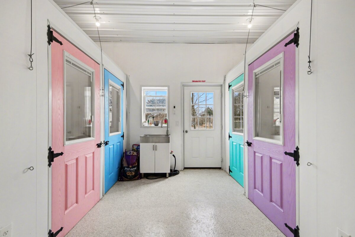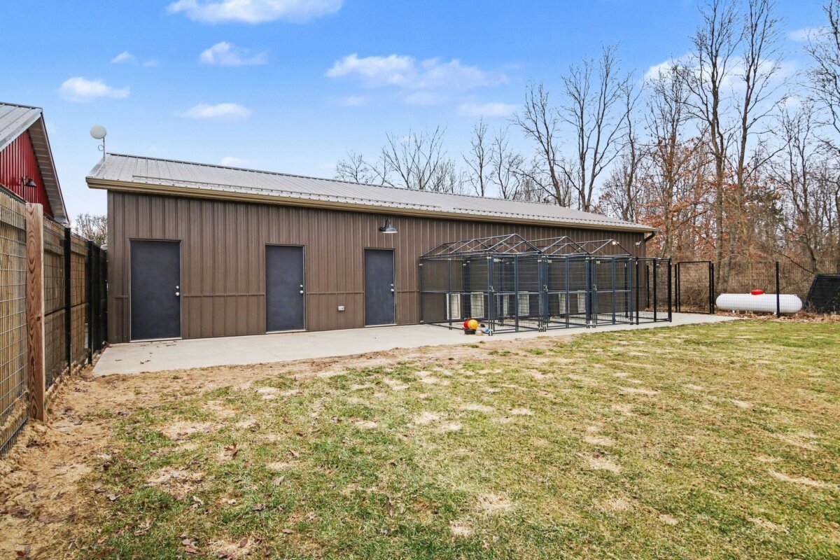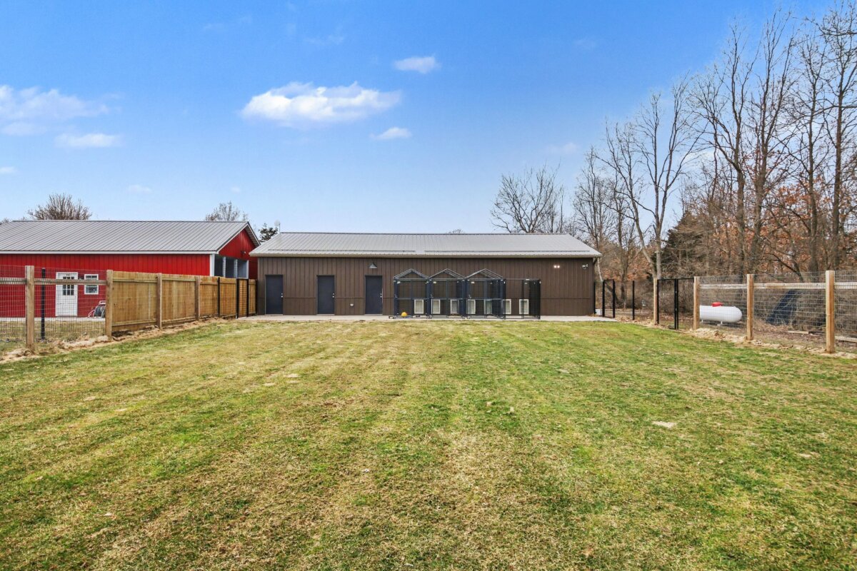An additional 10×10 room with exterior access provides flexible use. Expansion potential exists in the brown building. A large indoor training area (garage), two fenced dog yards, and the property’s extensive trail system offer ample room for exercise, training, and exploration.