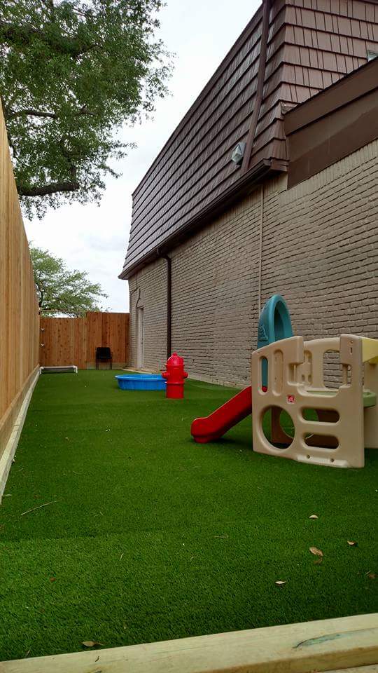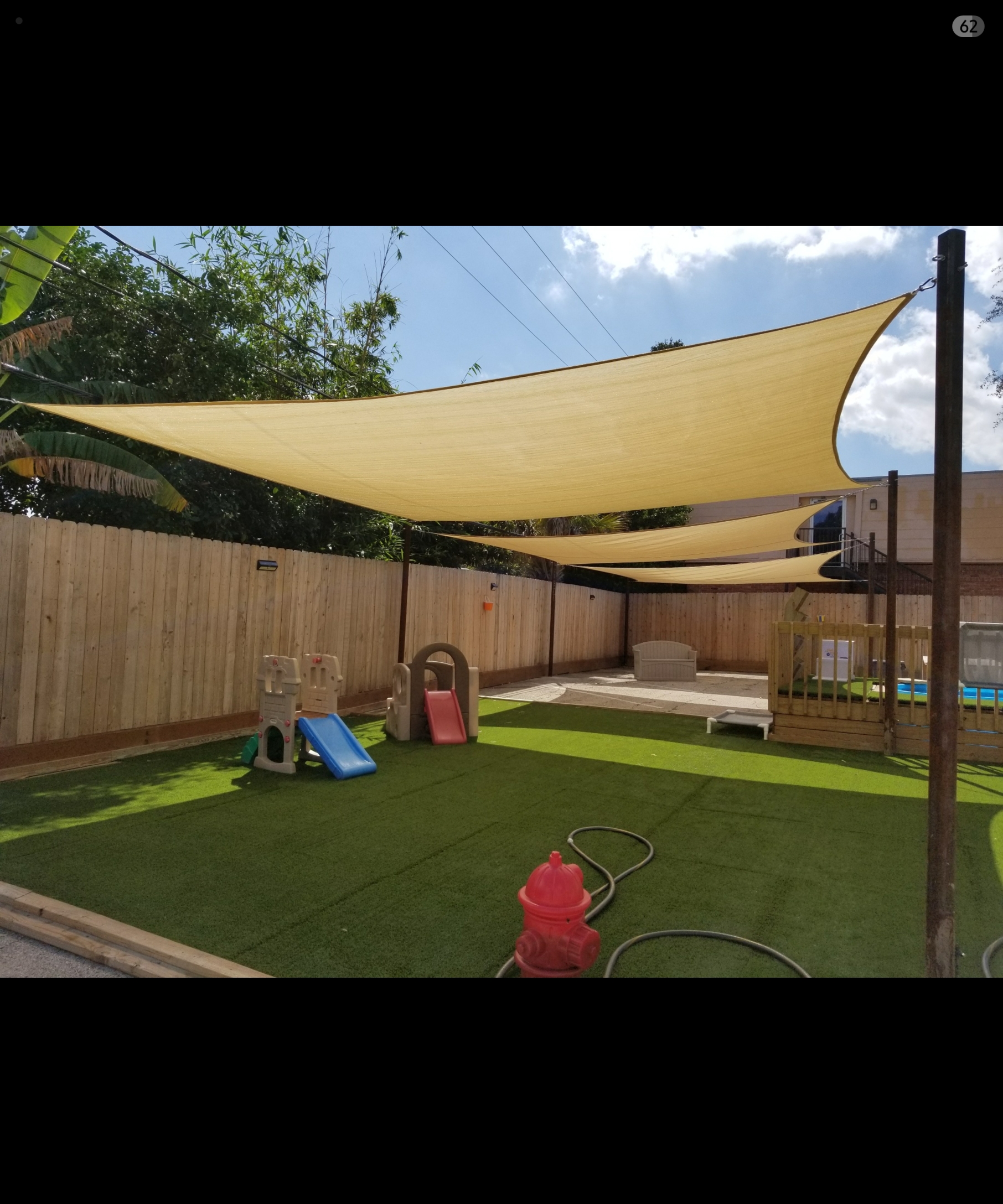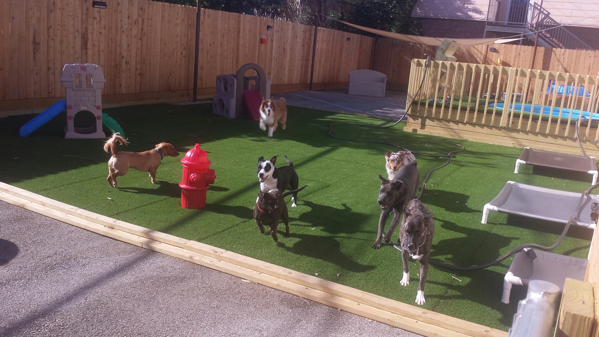 2 story commercial property on .67 acres with three outdoor play yards, K9 grass, Awnings, 7ft fencing, and commercial poles for sun shades.